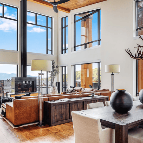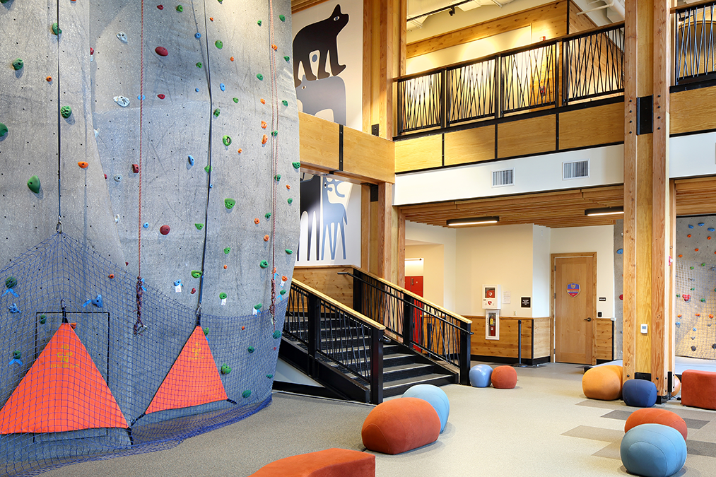 The Spruce Peak Adventure Center serves as the base for Stowe Mountain Resort’s year-round children’s activities. The Center features a three-story climbing wall and bouldering area, theater, arcade, café, and resort’s daycare. The 29,000 square foot facility features flexible multi-use spaces that evolve throughout the day and from season to season. The center’s boot-up area adapts into a movie theater with benches that convert to lounge seating. The Canteen serves as the ski school food service in the winter and converts to a teen hangout by day and family dining experience in the evening and the shoulder seasons. The building’s dynamic floor to ceiling windows highlight the activities inside and their relationship to Stowe’s majestic outdoor environment.