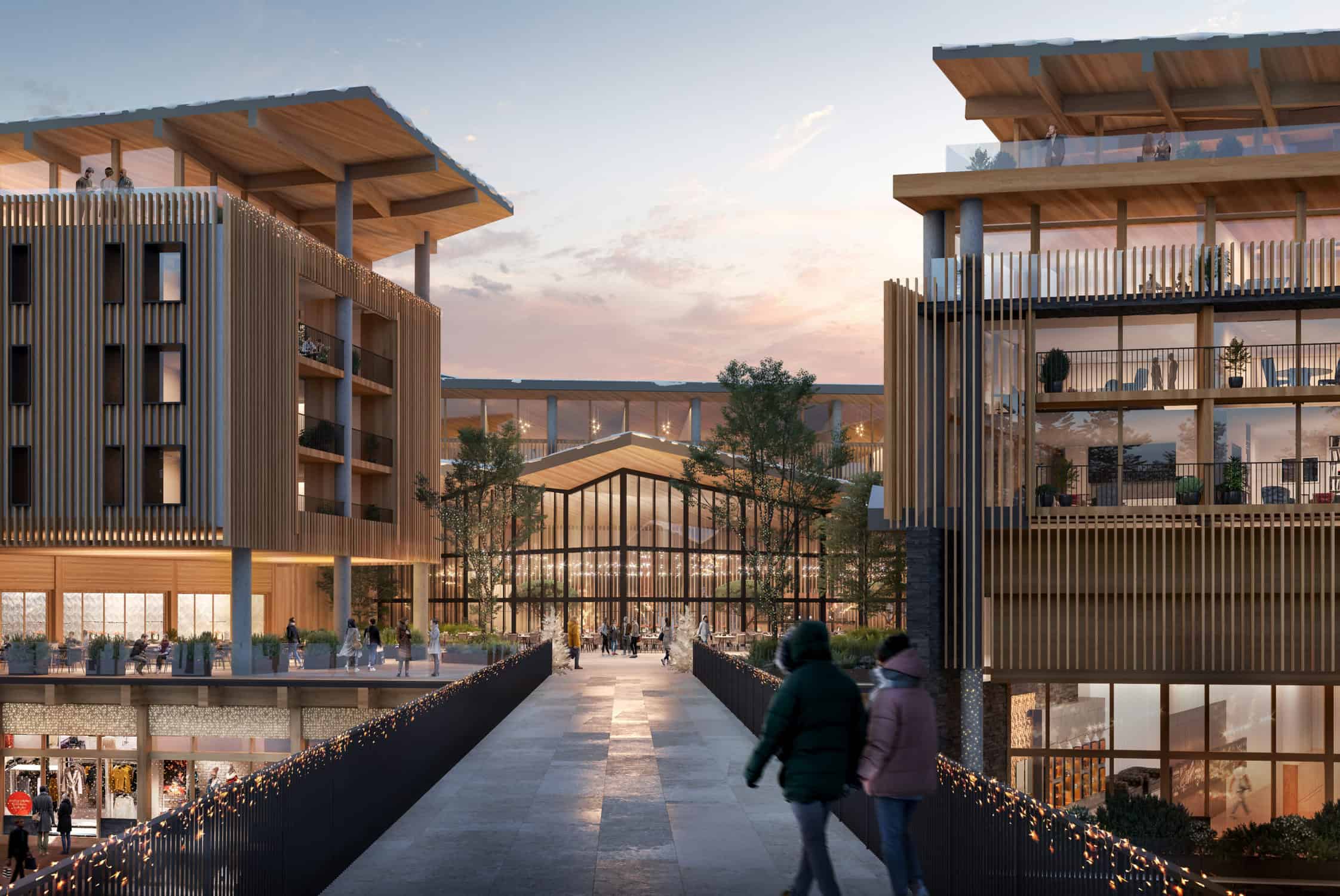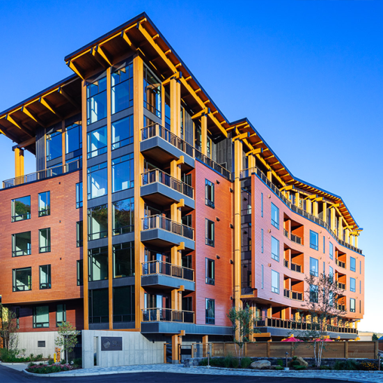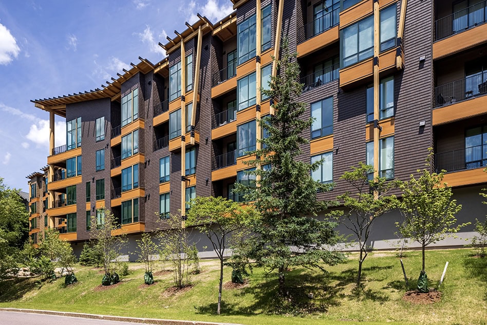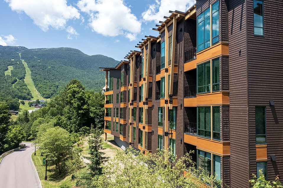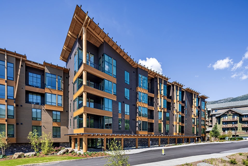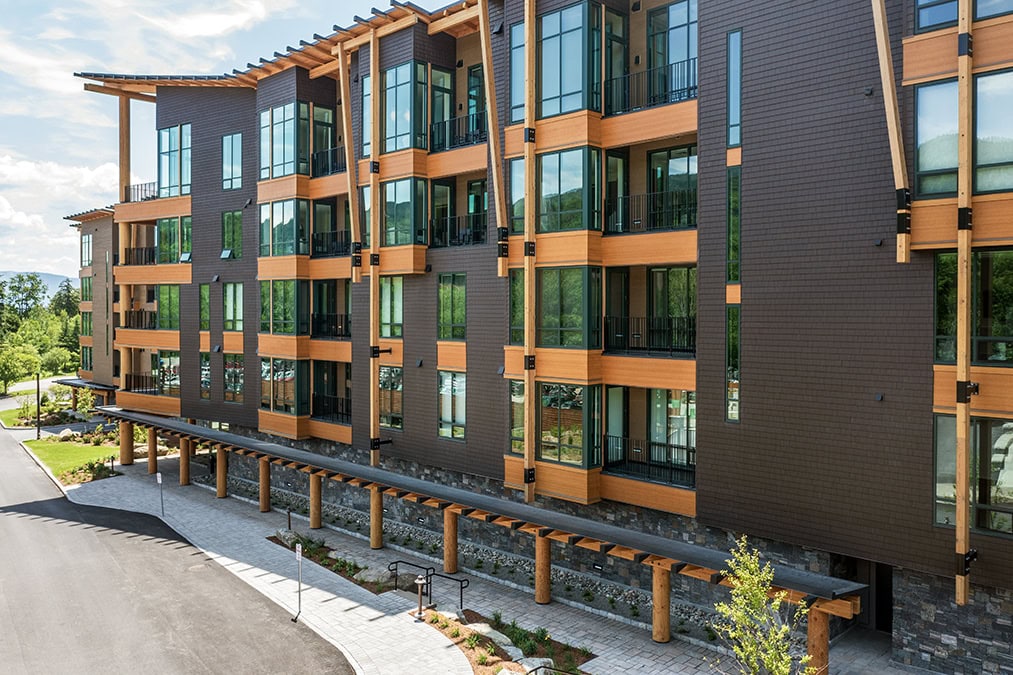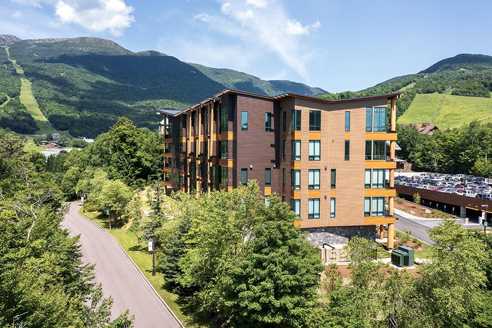 The Treehouse was designed to be part of the continuing evolution of a mountain village where its architecture is inspired by site, context and the natural environment. The structure boasts 48 residential condominium units over parking, drawing inspiration directly from its surroundings. It sits on a heavily wooded hillside site overlooking majestic mountains. A mature stand of trees provides a buffer to the adjacent highway while providing filtered views from the building to the landscape. Fitting of a building set in nature, signature design elements include stained shingles with a natural wood look, and heavy timber posts and beams inspired by the surrounding spruce, beech, maple, and birch trees. These tree-like forms are topped by canopies of heavy timber outriggers which break the façade and vary the eave height. The building is 100% electric and designed in accordance with energy conservation and preservation of the environment.